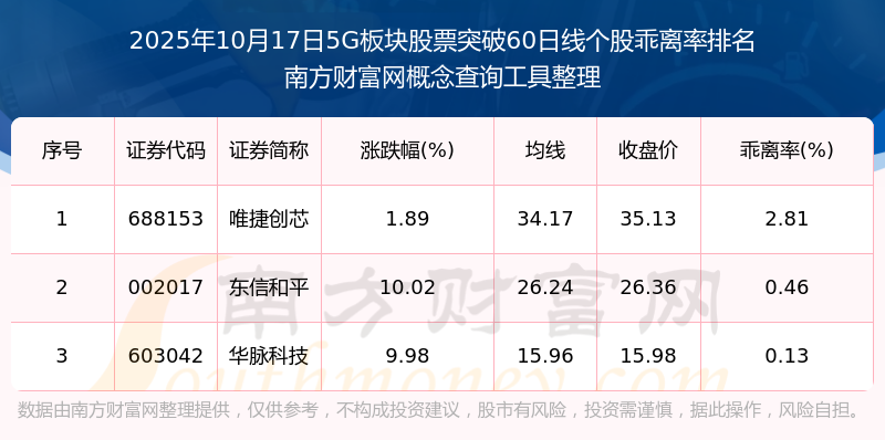 根据南方财富网概念查询工具数据统计,截止2025年10月17日收盘,5G板块股票共有3只个股收盘价向上突破了60日线。其中乖离率较大的个股有唯捷创芯、东信和平、华脉科技等,乖离率分别为2.81%、0.46%、0.13%。
