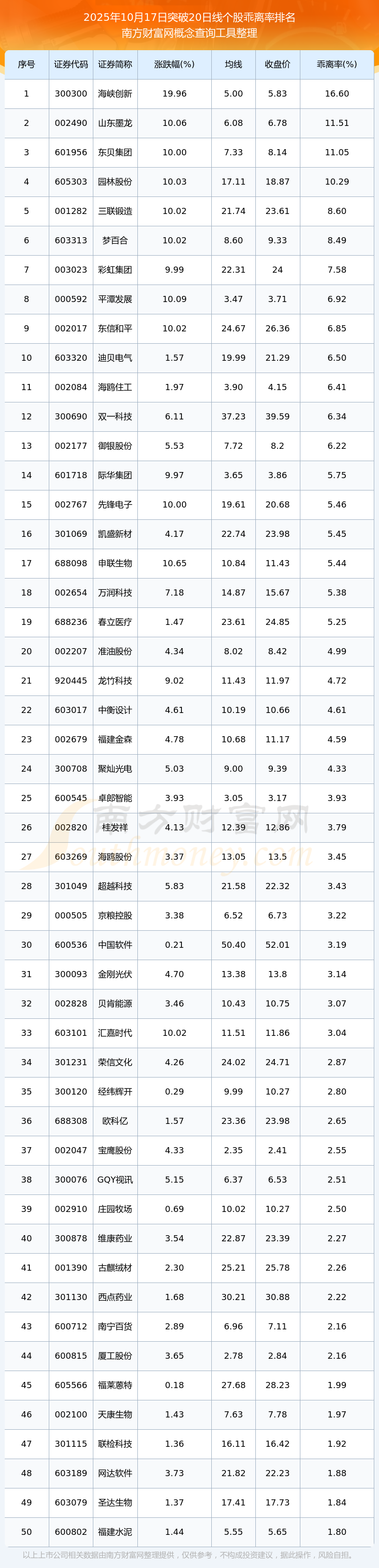 根据南方财富网概念查询工具数据统计,截止2025年10月17日收盘,共有108只个股收盘价向上突破了20日线,其中乖离率较大的个股有海峡创新、山东墨龙、东贝集团、园林股份、三联锻造等,乖离率分别为16.60%、11.51%、11.05%、10.29%、8.60%。
