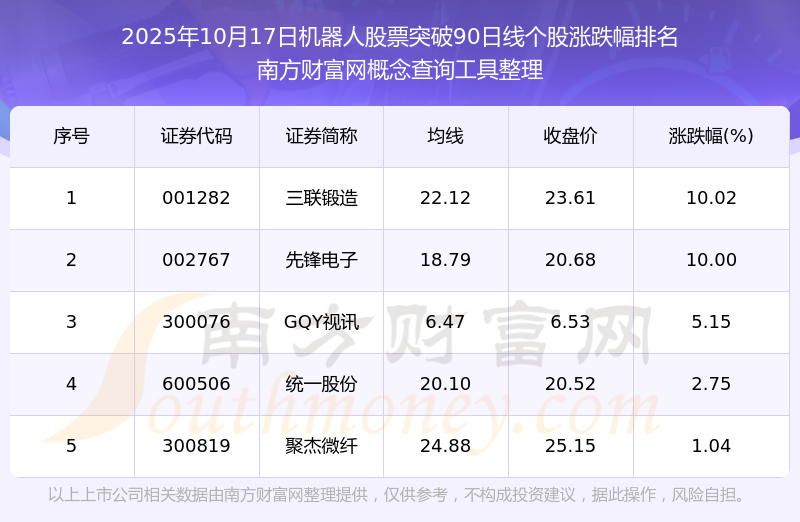 根据南方财富网概念查询工具数据统计,截止2025年10月17日收盘,机器人股票共有5只个股收盘价向上突破了90日线。其中涨幅较大的个股有三联锻造、先锋电子、GQY视讯等,涨幅分别为10.02%、10.00%、5.15%。