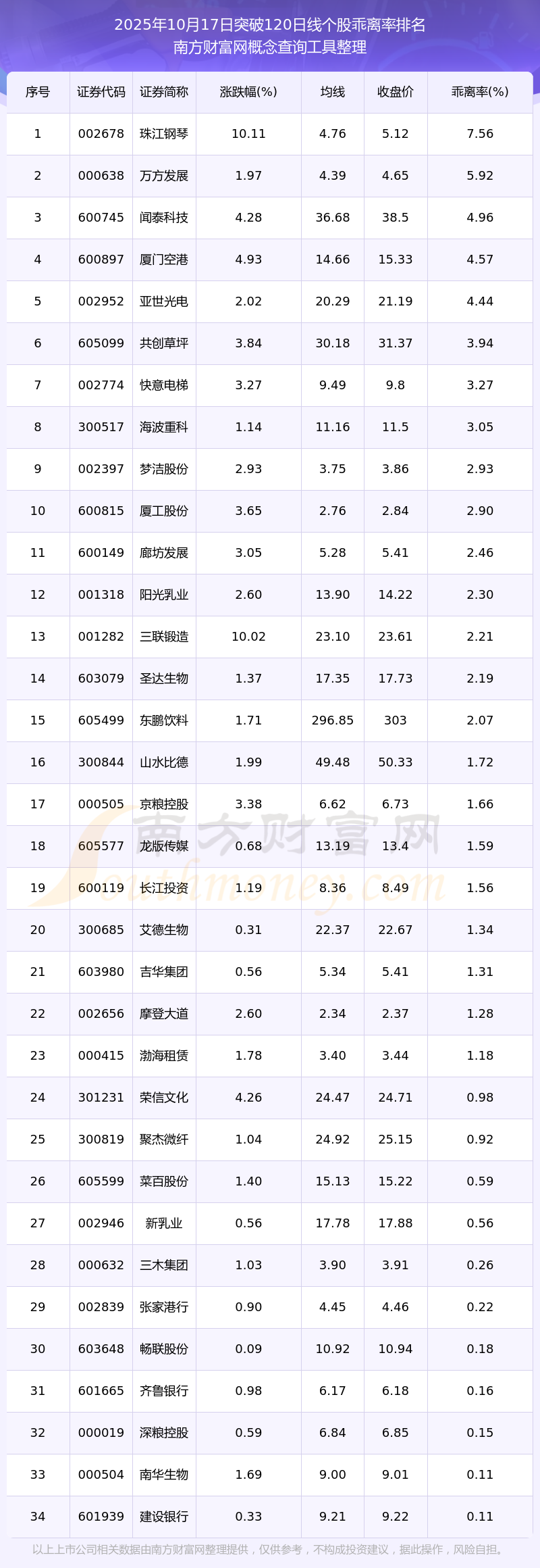 2025年10月17日突破120日线个股乖离率排名