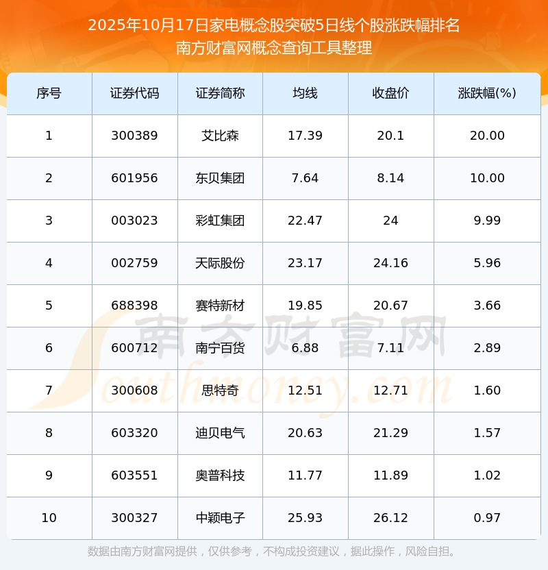 根据南方财富网概念查询工具数据统计,截止2025年10月17日收盘,家电概念股共有12只个股收盘价向上突破了5日线。其中涨幅较大的个股有艾比森、东贝集团、彩虹集团等,涨幅分别为20.00%、10.00%、9.99%。