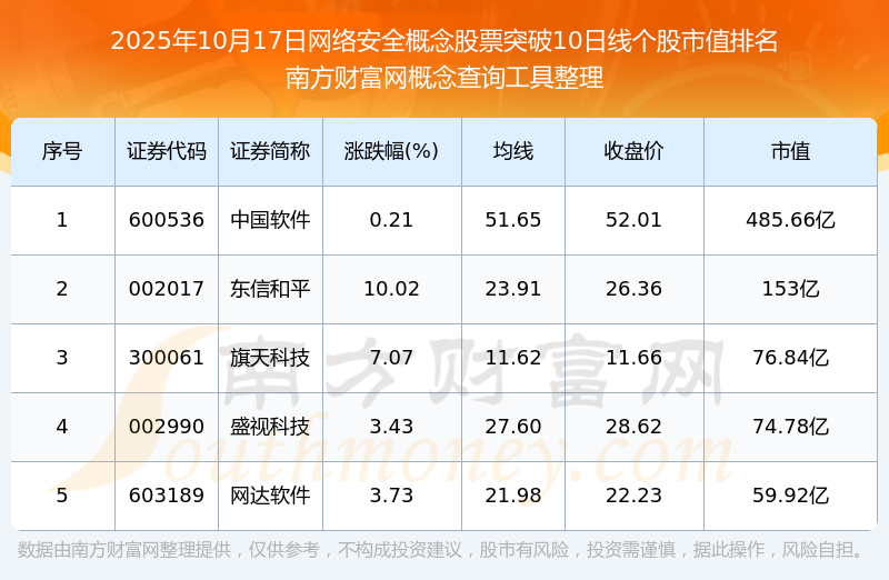 2025年10月17日网络安全概念股票突破10日线个股市值排名