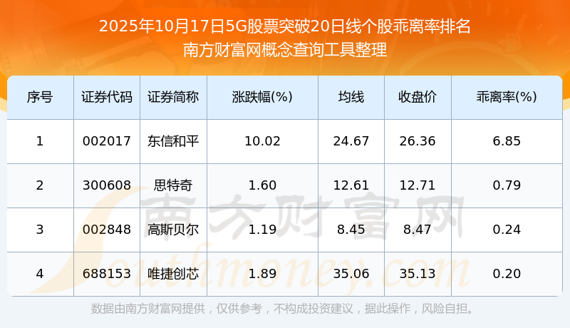 2025年10月17日5G股票突破20日线个股乖离率排名