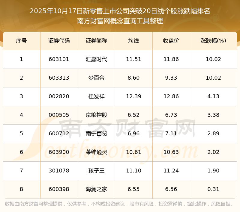 2025年10月17日新零售上市公司突破20日线个股涨跌幅排名