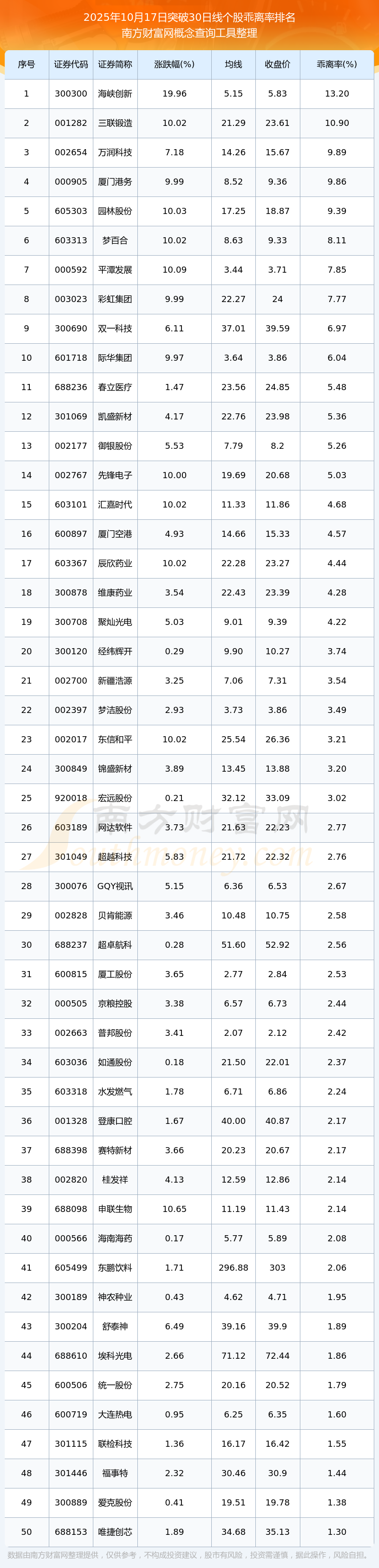 根据南方财富网概念查询工具数据统计,截止2025年10月17日收盘,共有100只个股收盘价向上突破了30日线,其中乖离率较大的个股有海峡创新、三联锻造、万润科技、厦门港务、园林股份等,乖离率分别为13.20%、10.90%、9.89%、9.86%、9.39%。