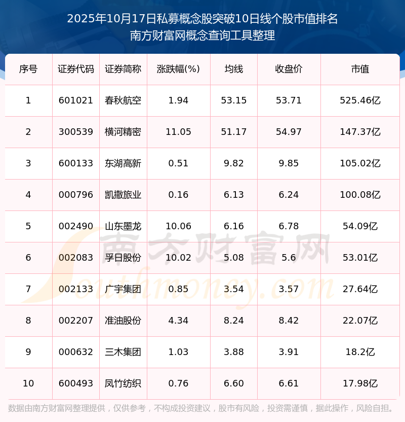 根据南方财富网概念查询工具数据统计,截止2025年10月17日收盘,私募概念股共有10只个股收盘价向上突破了10日线。其中市值较大的个股有春秋航空、横河精密、东湖高新等,市值分别为525.46亿、147.37亿、105.02亿。