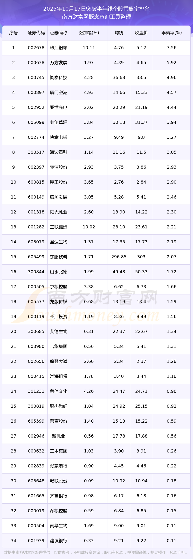 根据南方财富网概念查询工具数据统计,截止2025年10月17日收盘,共有34只个股收盘价向上突破了半年线,其中乖离率较大的个股有珠江钢琴、万方发展、闻泰科技、厦门空港、亚世光电等,乖离率分别为7.56%、5.92%、4.96%、4.57%、4.44%。