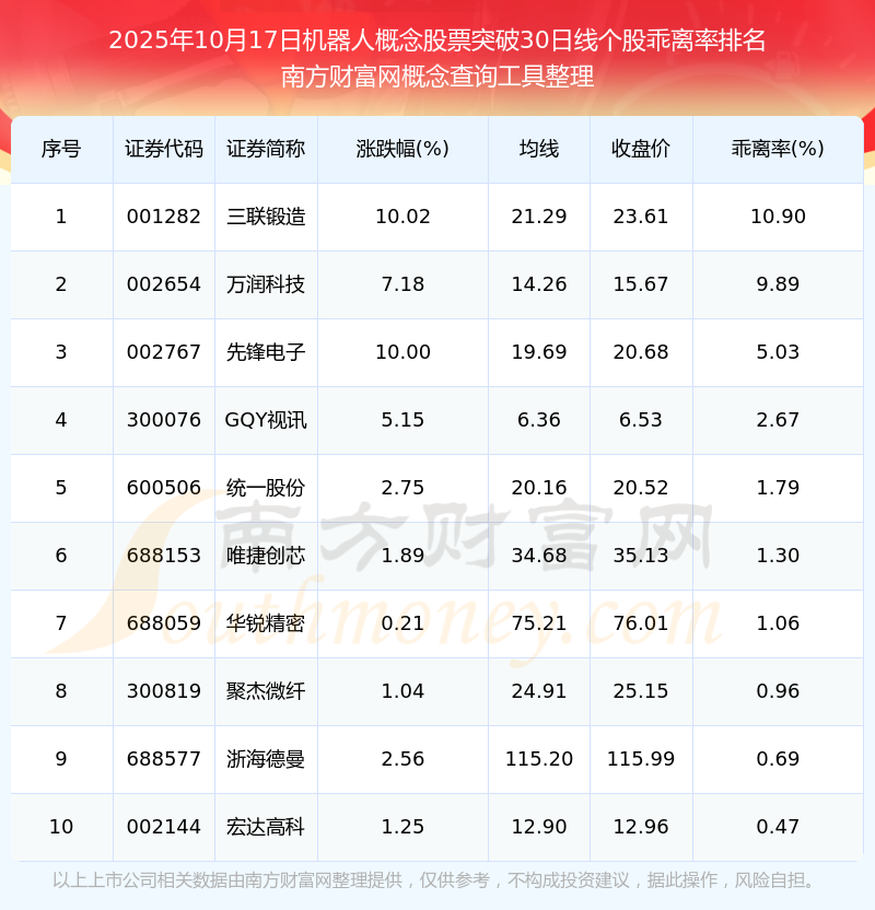 根据南方财富网概念查询工具数据统计,截止2025年10月17日收盘,机器人概念股票共有13只个股收盘价向上突破了30日线。其中乖离率较大的个股有三联锻造、万润科技、先锋电子等,乖离率分别为10.90%、9.89%、5.03%。