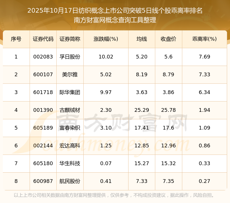 2025年10月17日纺织概念上市公司突破5日线个股乖离率排名