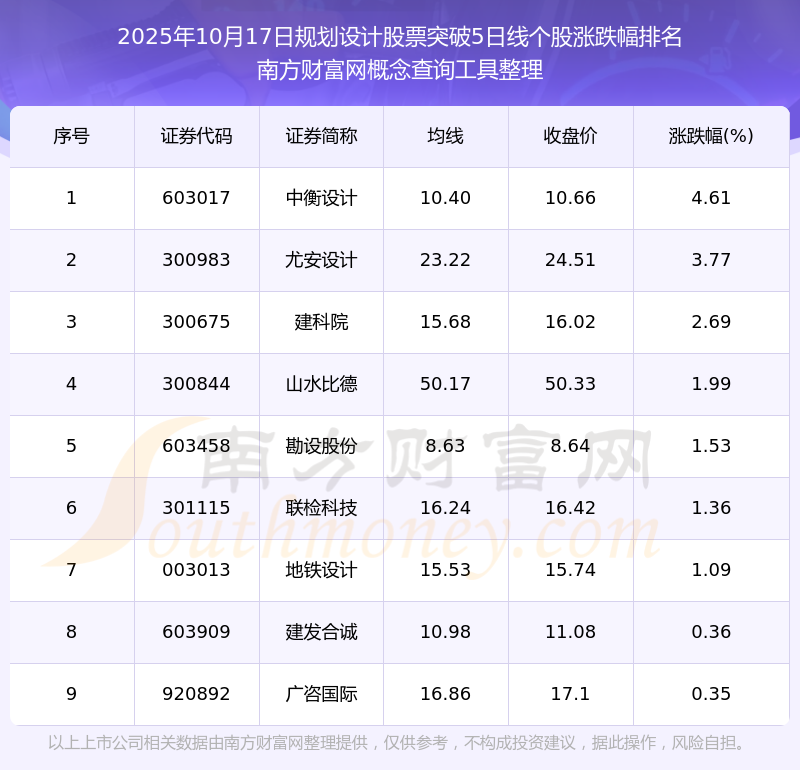 2025年10月17日规划设计股票突破5日线个股涨跌幅排名