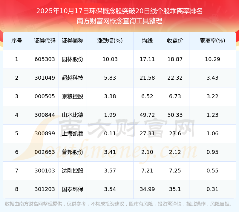 根据南方财富网概念查询工具数据统计,截止2025年10月17日收盘,环保概念股共有8只个股收盘价向上突破了20日线。其中乖离率较大的个股有园林股份、超越科技、京粮控股等,乖离率分别为10.29%、3.43%、3.22%。