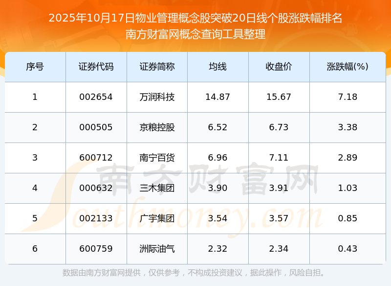 根据南方财富网概念查询工具数据统计,截止2025年10月17日收盘,物业管理概念股共有6只个股收盘价向上突破了20日线。其中涨幅较大的个股有万润科技、京粮控股、南宁百货等,涨幅分别为7.18%、3.38%、2.89%。