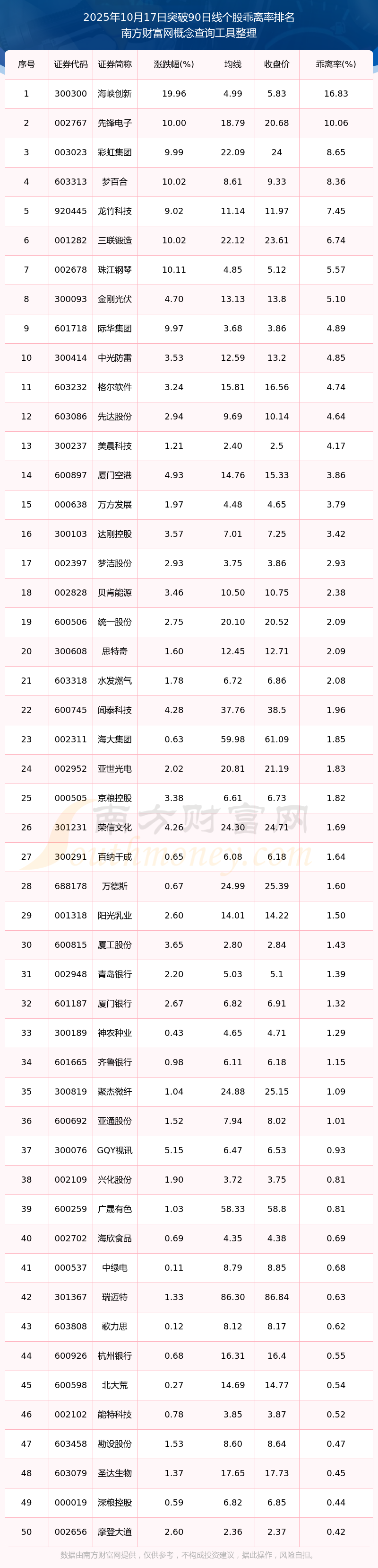 根据南方财富网概念查询工具数据统计,截止2025年10月17日收盘,共有59只个股收盘价向上突破了90日线,其中乖离率较大的个股有海峡创新、先锋电子、彩虹集团、梦百合、龙竹科技等,乖离率分别为16.83%、10.06%、8.65%、8.36%、7.45%。