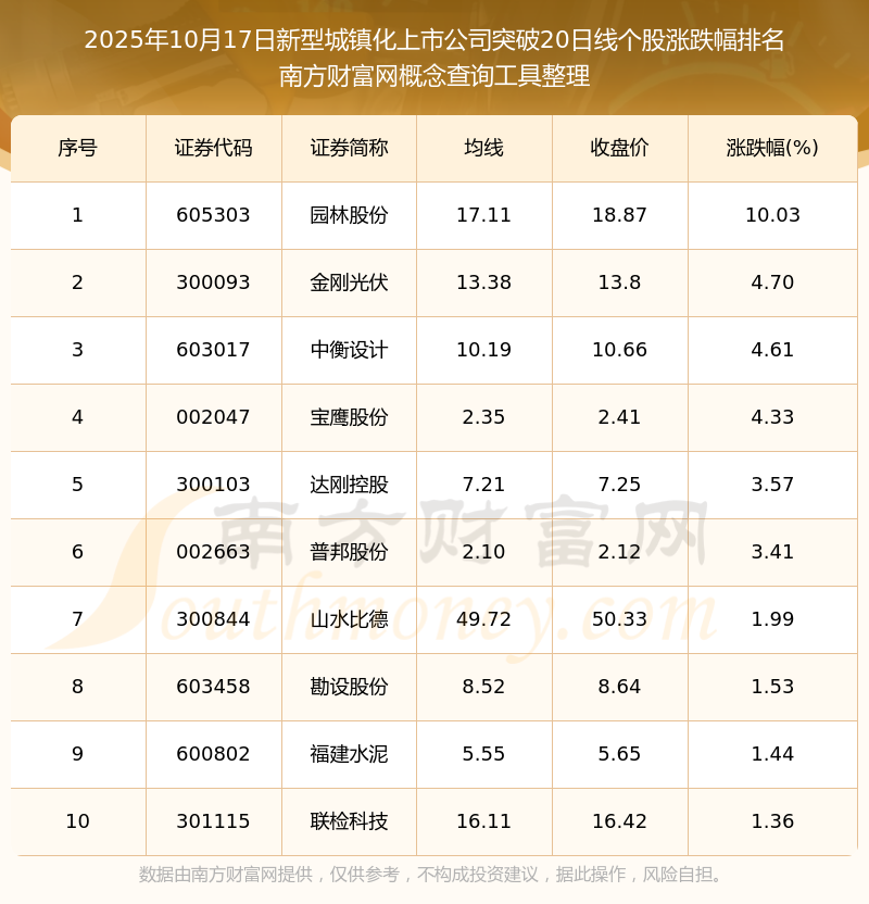 2025年10月17日新型城镇化上市公司突破20日线个股涨跌幅排名