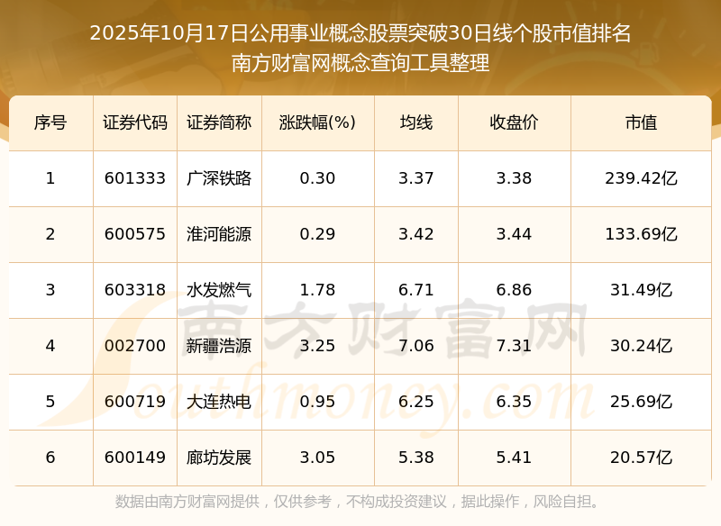 根据南方财富网概念查询工具数据统计,截止2025年10月17日收盘,公用事业概念股票共有6只个股收盘价向上突破了30日线。其中市值较大的个股有广深铁路、淮河能源、水发燃气等,市值分别为239.42亿、133.69亿、31.49亿。