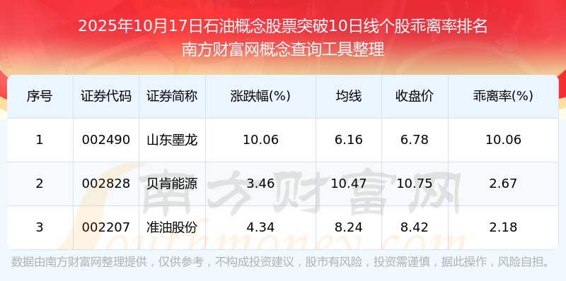 根据南方财富网概念查询工具数据统计,截止2025年10月17日收盘,石油概念股票共有3只个股收盘价向上突破了10日线。其中乖离率较大的个股有山东墨龙、贝肯能源、准油股份等,乖离率分别为10.06%、2.67%、2.18%。