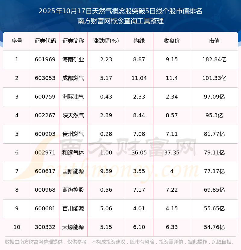 2025年10月17日天然气概念股突破5日线个股市值排名
