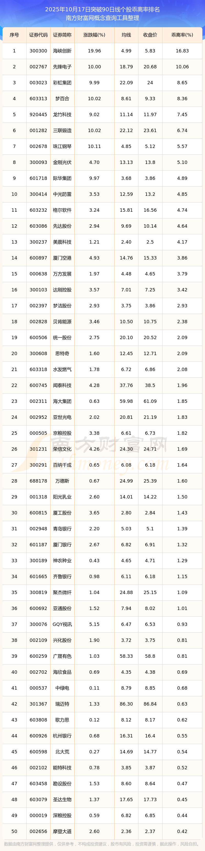 根据南方财富网概念查询工具数据统计,截止2025年10月17日收盘,共有59只个股收盘价向上突破了90日线,其中乖离率较大的个股有海峡创新、先锋电子、彩虹集团、梦百合、龙竹科技等,乖离率分别为16.83%、10.06%、8.65%、8.36%、7.45%。