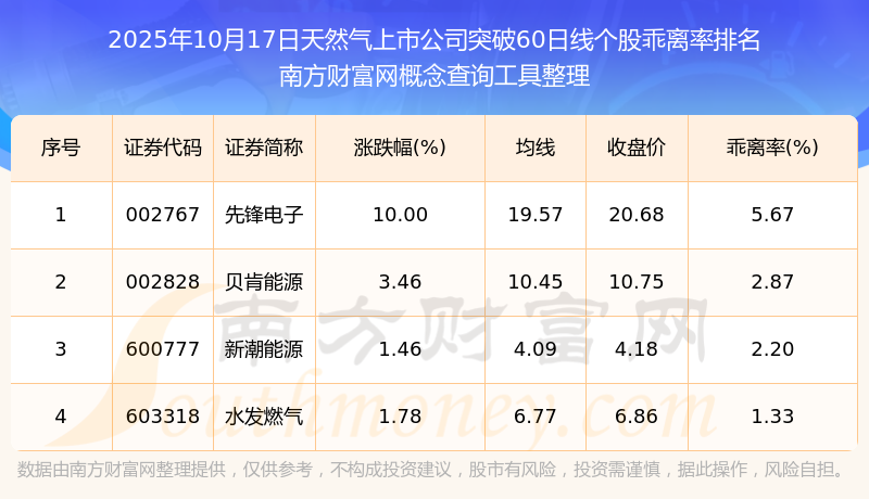 2025年10月17日天然气上市公司突破60日线个股乖离率排名