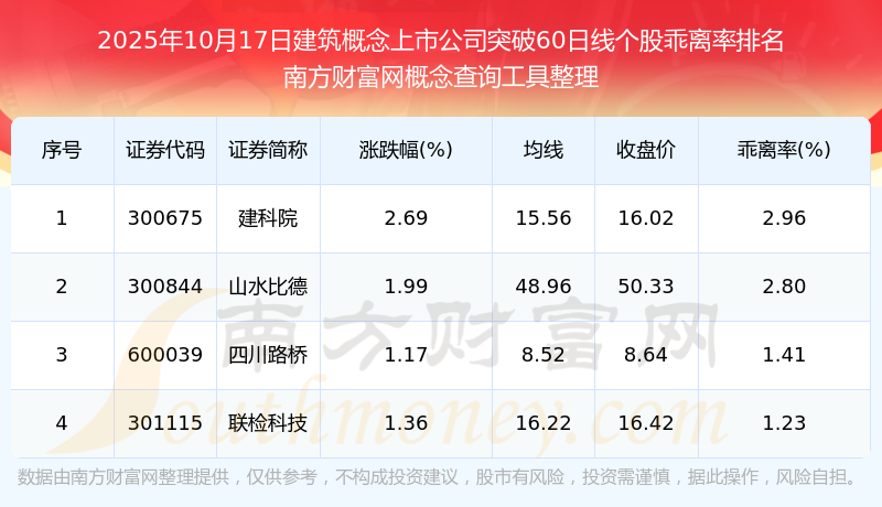 根据南方财富网概念查询工具数据统计,截止2025年10月17日收盘,建筑概念上市公司共有4只个股收盘价向上突破了60日线。其中乖离率较大的个股有建科院、山水比德、四川路桥等,乖离率分别为2.96%、2.80%、1.41%。