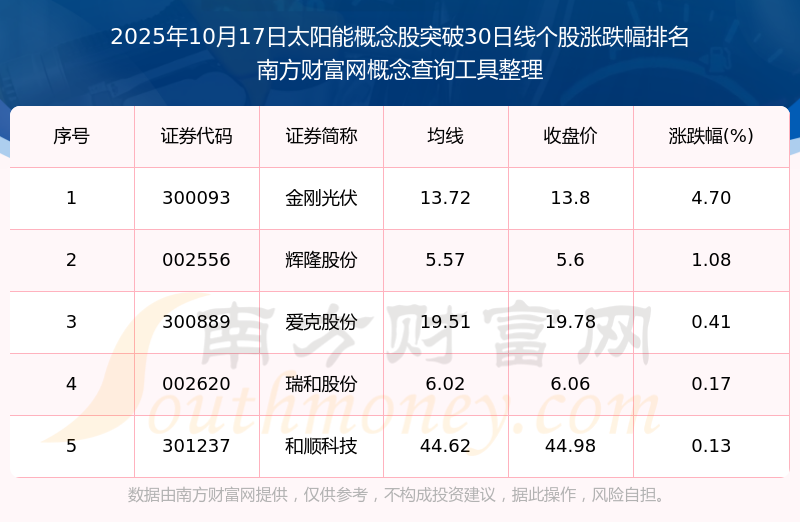 根据南方财富网概念查询工具数据统计,截止2025年10月17日收盘,太阳能概念股共有5只个股收盘价向上突破了30日线。其中涨幅较大的个股有金刚光伏、辉隆股份、爱克股份等,涨幅分别为4.70%、1.08%、0.41%。