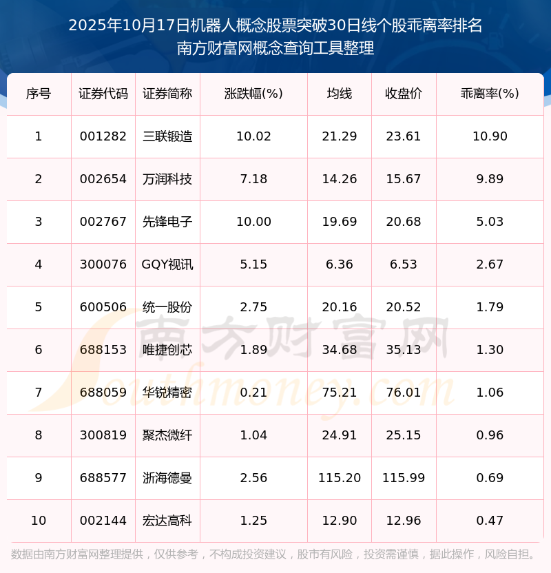 根据南方财富网概念查询工具数据统计,截止2025年10月17日收盘,机器人概念股票共有13只个股收盘价向上突破了30日线。其中乖离率较大的个股有三联锻造、万润科技、先锋电子等,乖离率分别为10.90%、9.89%、5.03%。