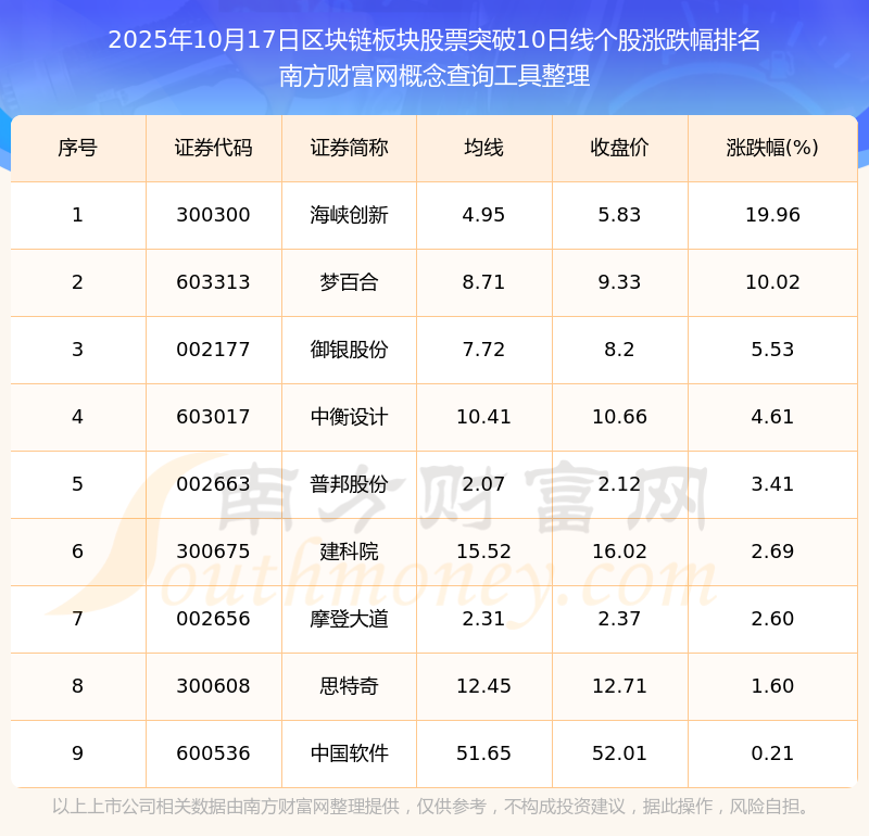 2025年10月17日区块链板块股票突破10日线个股涨跌幅排名