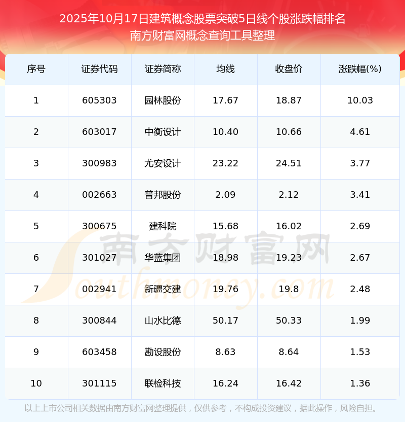根据南方财富网概念查询工具数据统计,截止2025年10月17日收盘,建筑概念股票共有21只个股收盘价向上突破了5日线。其中涨幅较大的个股有园林股份、中衡设计、尤安设计等,涨幅分别为10.03%、4.61%、3.77%。