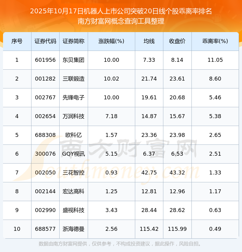 2025年10月17日机器人上市公司突破20日线个股乖离率排名