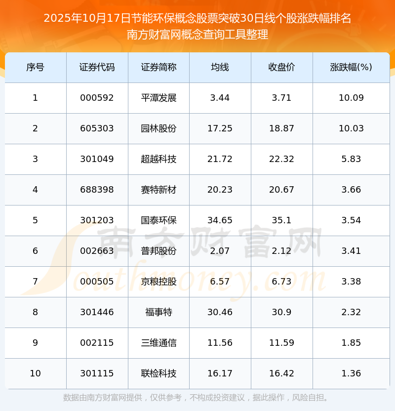 2025年10月17日节能环保概念股票突破30日线个股涨跌幅排名