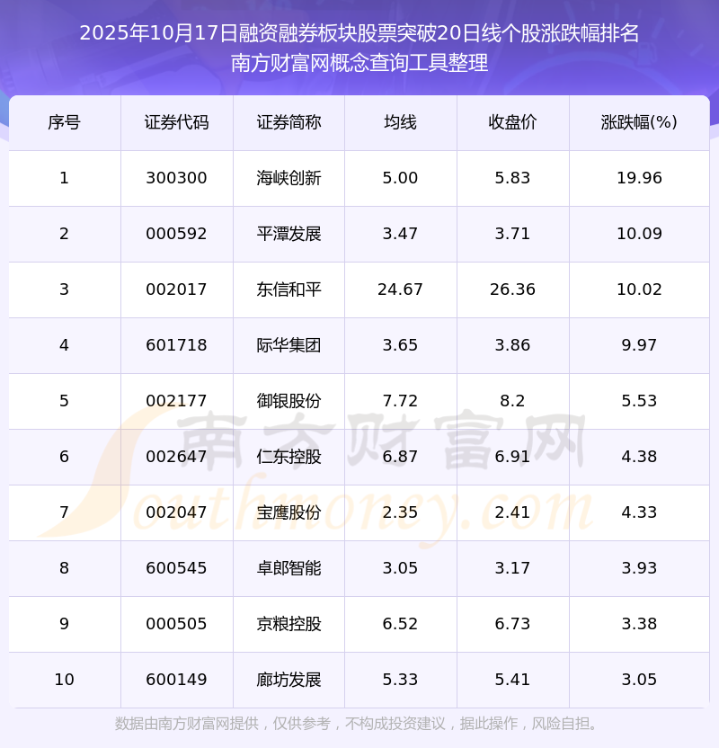 2025年10月17日融资融券板块股票突破20日线个股涨跌幅排名