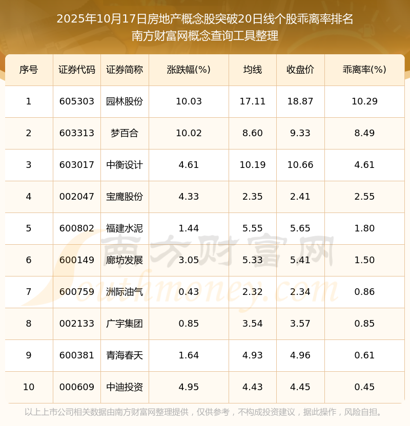 2025年10月17日房地产概念股突破20日线个股乖离率排名