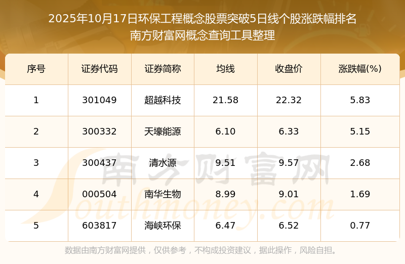根据南方财富网概念查询工具数据统计,截止2025年10月17日收盘,环保工程概念股票共有5只个股收盘价向上突破了5日线。其中涨幅较大的个股有超越科技、天壕能源、清水源等,涨幅分别为5.83%、5.15%、2.68%。