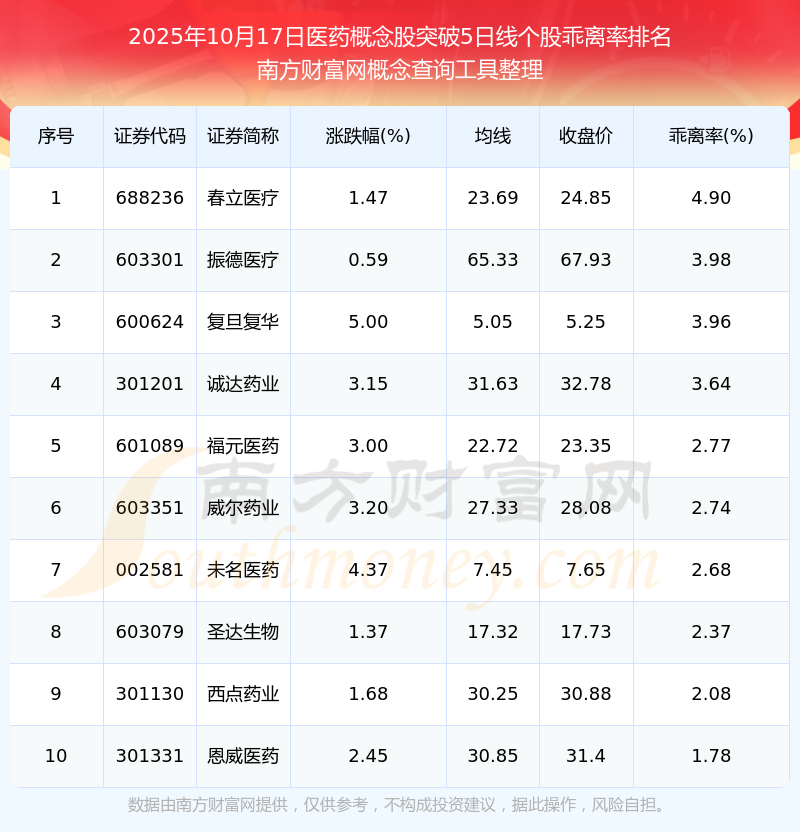 根据南方财富网概念查询工具数据统计,截止2025年10月17日收盘,医药概念股共有22只个股收盘价向上突破了5日线。其中乖离率较大的个股有春立医疗、振德医疗、复旦复华等,乖离率分别为4.90%、3.98%、3.96%。