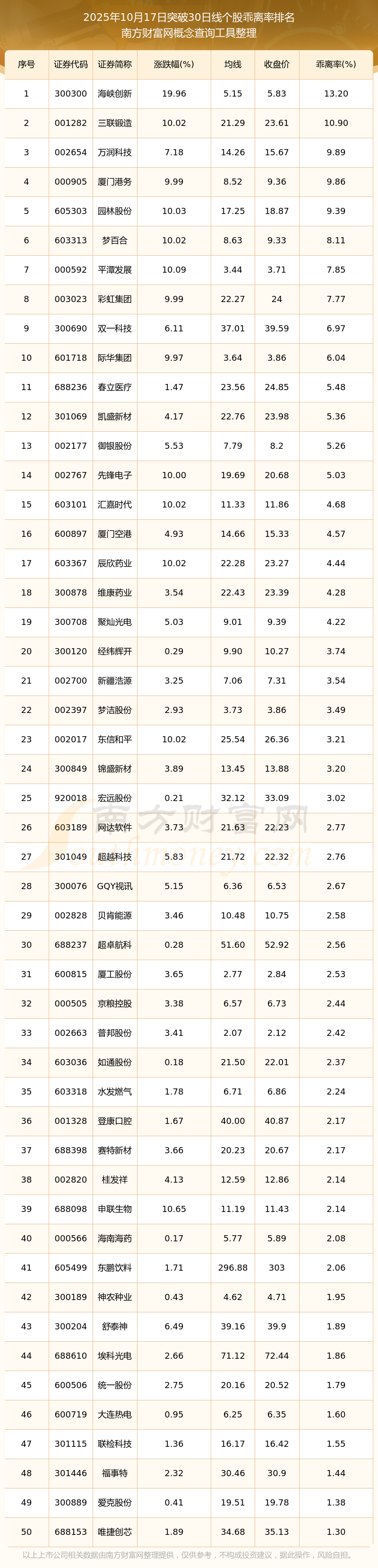 根据南方财富网概念查询工具数据统计,截止2025年10月17日收盘,共有100只个股收盘价向上突破了30日线,其中乖离率较大的个股有海峡创新、三联锻造、万润科技、厦门港务、园林股份等,乖离率分别为13.20%、10.90%、9.89%、9.86%、9.39%。