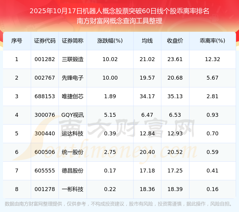 根据南方财富网概念查询工具数据统计,截止2025年10月17日收盘,机器人概念股票共有8只个股收盘价向上突破了60日线。其中乖离率较大的个股有三联锻造、先锋电子、唯捷创芯等,乖离率分别为12.32%、5.67%、2.81%。