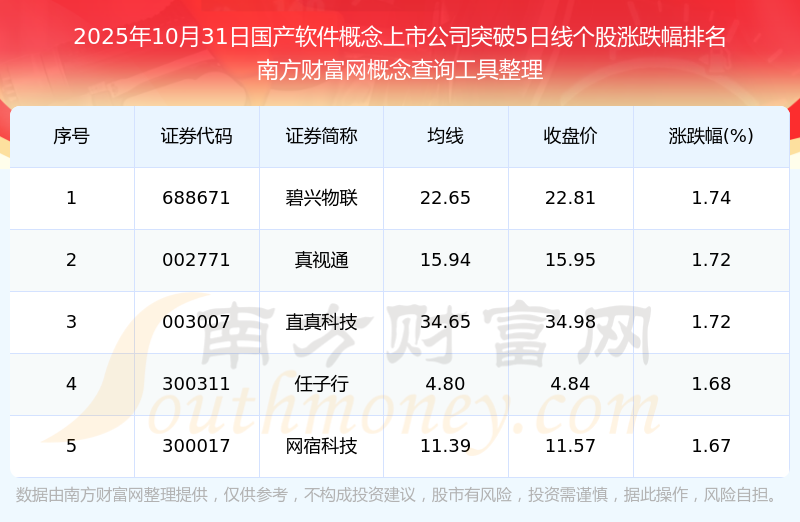 根据南方财富网概念查询工具数据统计,截止2025年10月31日收盘,国产软件概念上市公司共有5只个股收盘价向上突破了5日线。其中涨幅较大的个股有碧兴物联、真视通、直真科技等,涨幅分别为1.74%、1.72%、1.72%。