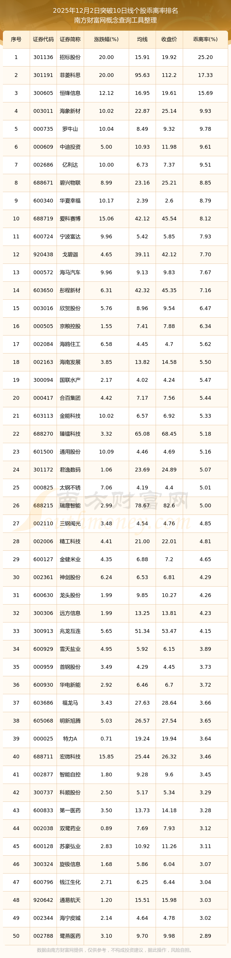 根据南方财富网概念查询工具数据统计,截止2025年12月2日收盘,共有194只个股收盘价向上突破了10日线,其中乖离率较大的个股有招标股份、菲菱科思、恒锋信息、海象新材、罗牛山等,乖离率分别为25.20%、17.33%、15.69%、9.93%、9.78%。