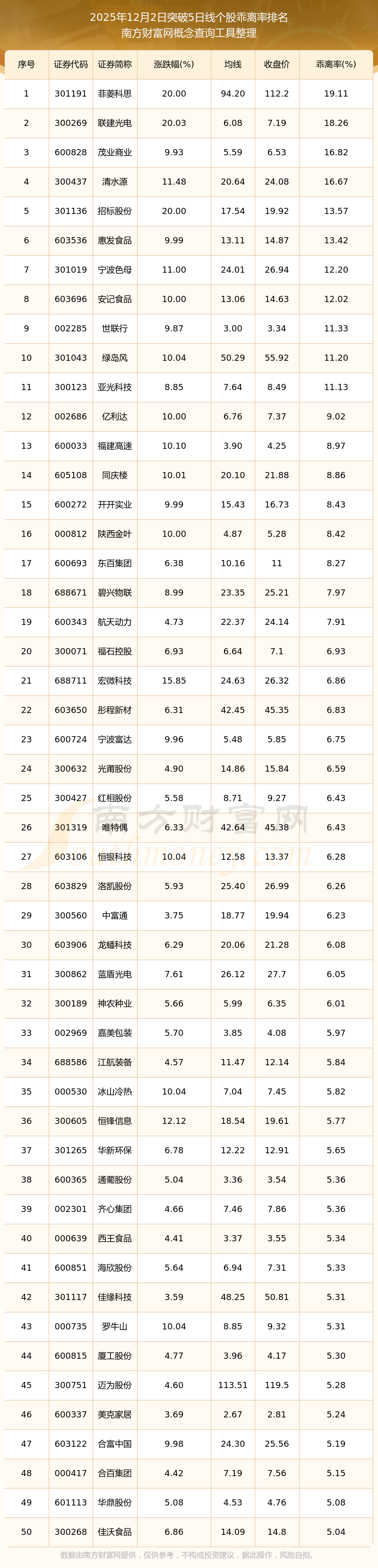 根据南方财富网概念查询工具数据统计,截止2025年12月2日收盘,共有317只个股收盘价向上突破了5日线,其中乖离率较大的个股有菲菱科思、联建光电、茂业商业、清水源、招标股份等,乖离率分别为19.11%、18.26%、16.82%、16.67%、13.57%。
