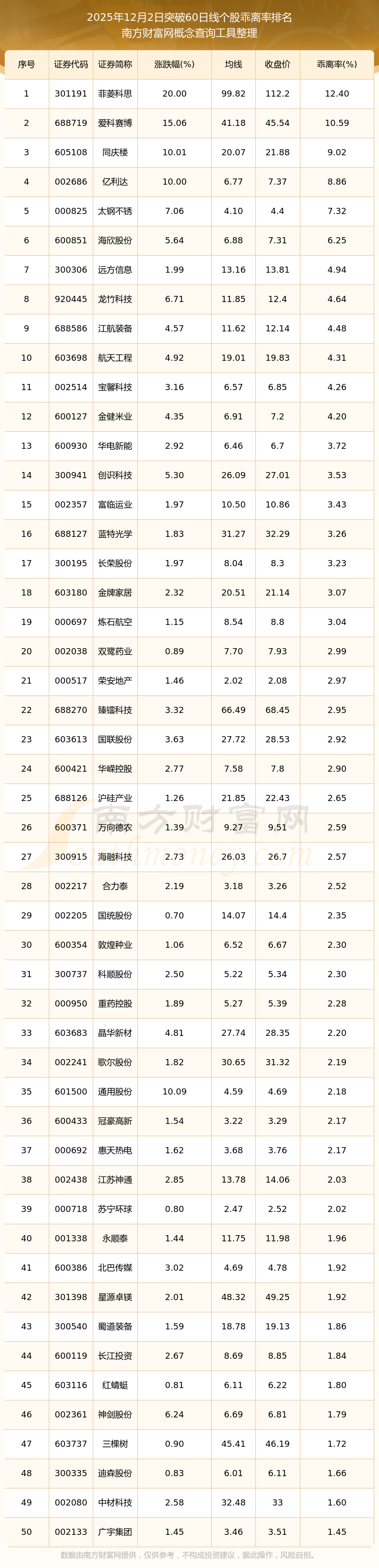 2025年12月2日突破60日线个股乖离率排名