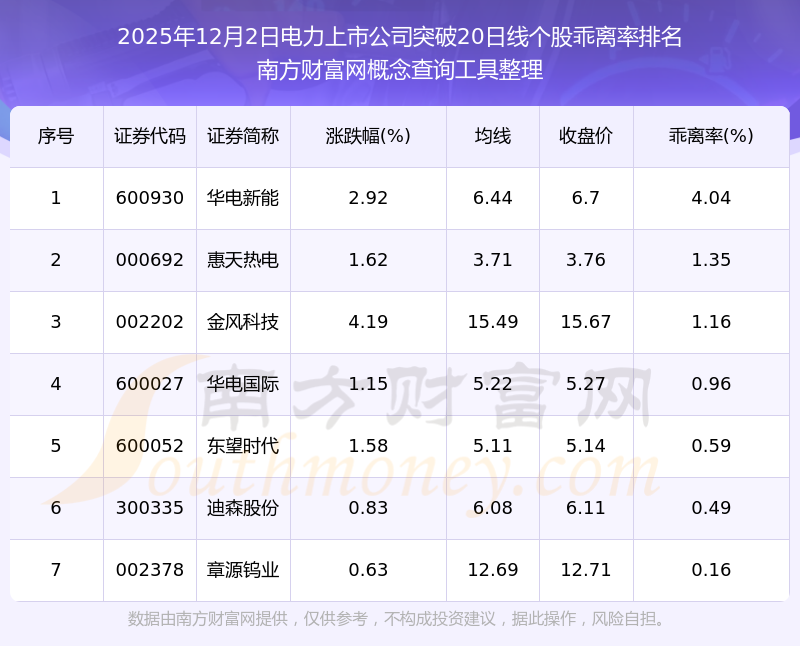 2025年12月2日电力上市公司突破20日线个股乖离率排名