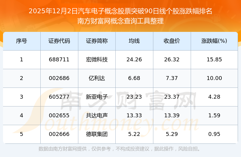 根据南方财富网概念查询工具数据统计,截止2025年12月2日收盘,汽车电子概念股票共有5只个股收盘价向上突破了90日线。其中涨幅较大的个股有宏微科技、亿利达、新亚电子等,涨幅分别为15.85%、10.00%、4.28%。