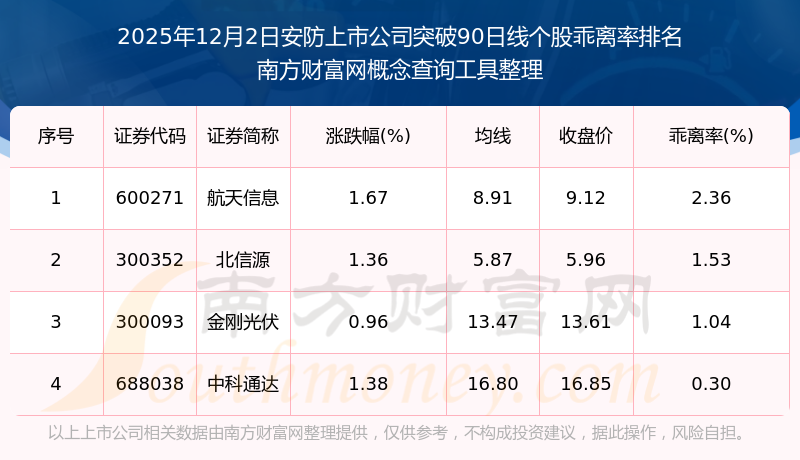 根据南方财富网概念查询工具数据统计,截止2025年12月2日收盘,安防上市公司共有4只个股收盘价向上突破了90日线。其中乖离率较大的个股有航天信息、北信源、金刚光伏等,乖离率分别为2.36%、1.53%、1.04%。