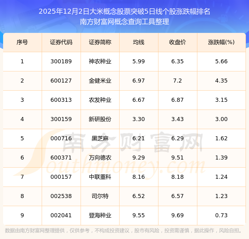 根据南方财富网概念查询工具数据统计,截止2025年12月2日收盘,大米概念股票共有9只个股收盘价向上突破了5日线。其中涨幅较大的个股有神农种业、金健米业、农发种业等,涨幅分别为5.66%、4.35%、3.15%。