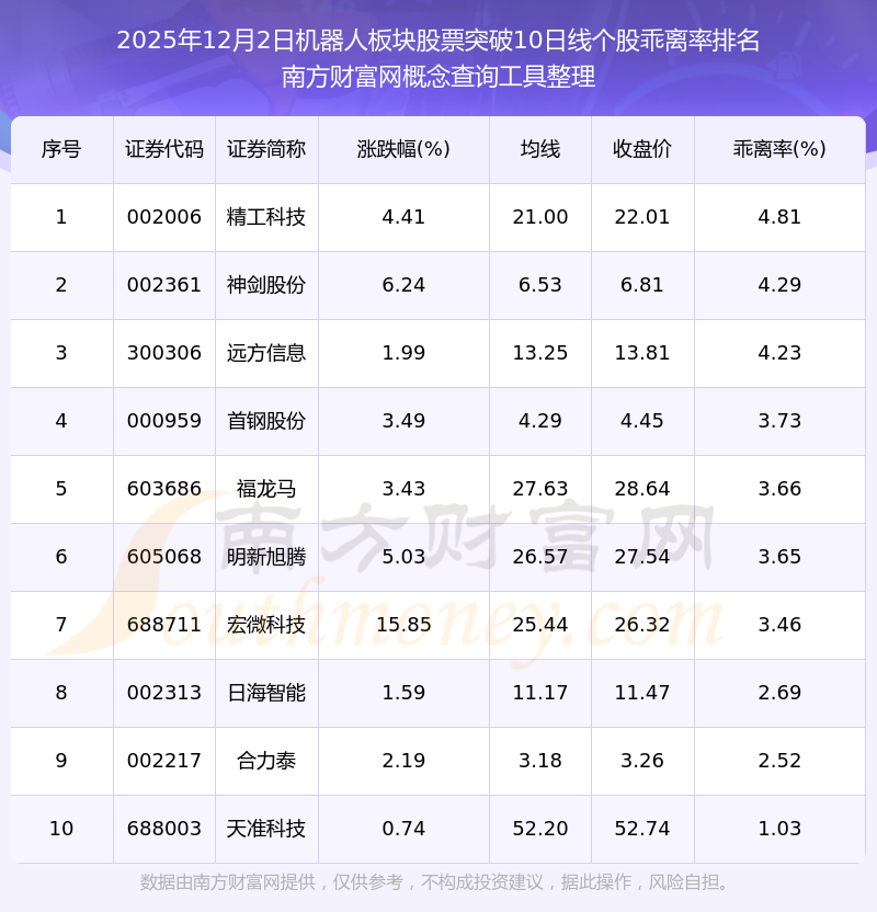 2025年12月2日机器人板块股票突破10日线个股乖离率排名