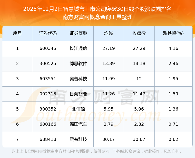 根据南方财富网概念查询工具数据统计,截止2025年12月2日收盘,智慧城市上市公司共有7只个股收盘价向上突破了30日线。其中涨幅较大的个股有长江通信、博思软件、奥普科技等,涨幅分别为4.16%、2.46%、1.95%。