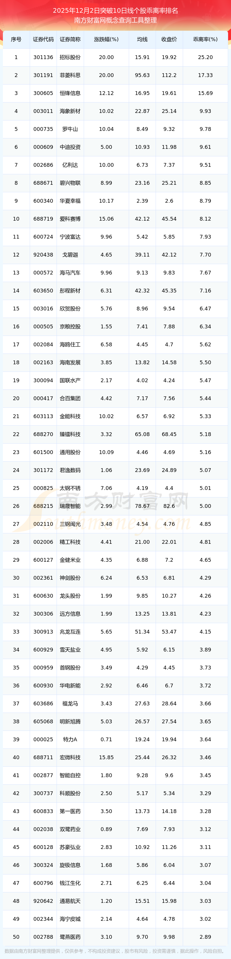 根据南方财富网概念查询工具数据统计,截止2025年12月2日收盘,共有194只个股收盘价向上突破了10日线,其中乖离率较大的个股有招标股份、菲菱科思、恒锋信息、海象新材、罗牛山等,乖离率分别为25.20%、17.33%、15.69%、9.93%、9.78%。