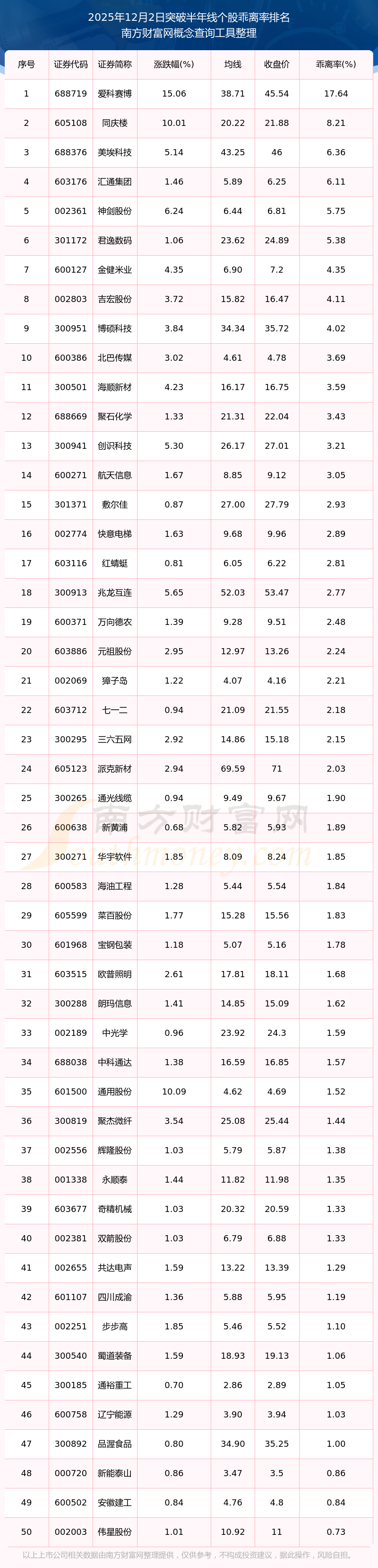 2025年12月2日突破半年线个股乖离率排名