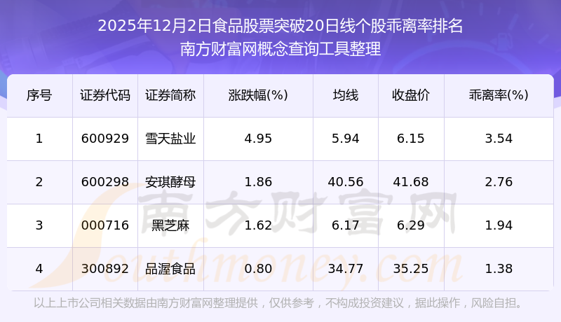 根据南方财富网概念查询工具数据统计,截止2025年12月2日收盘,食品股票共有4只个股收盘价向上突破了20日线。其中乖离率较大的个股有雪天盐业、安琪酵母、黑芝麻等,乖离率分别为3.54%、2.76%、1.94%。