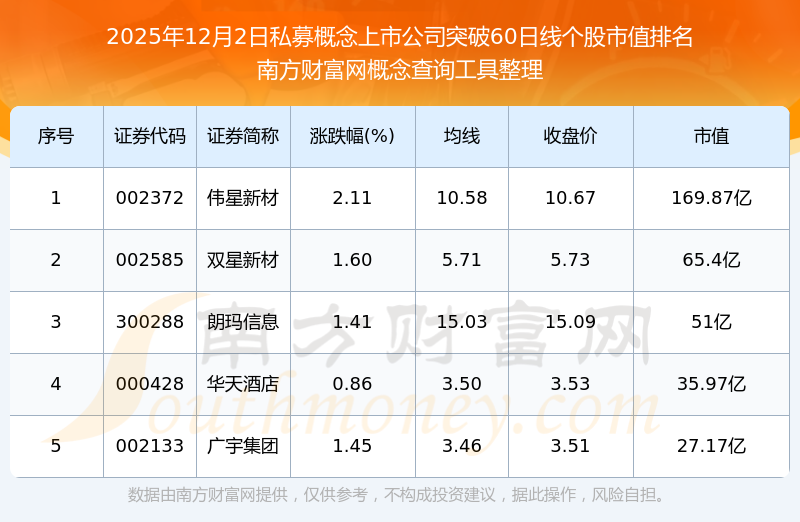 根据南方财富网概念查询工具数据统计,截止2025年12月2日收盘,私募概念上市公司共有5只个股收盘价向上突破了60日线。其中市值较大的个股有伟星新材、双星新材、朗玛信息等,市值分别为169.87亿、65.4亿、51亿。